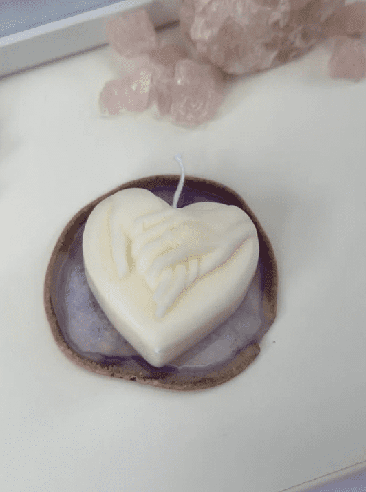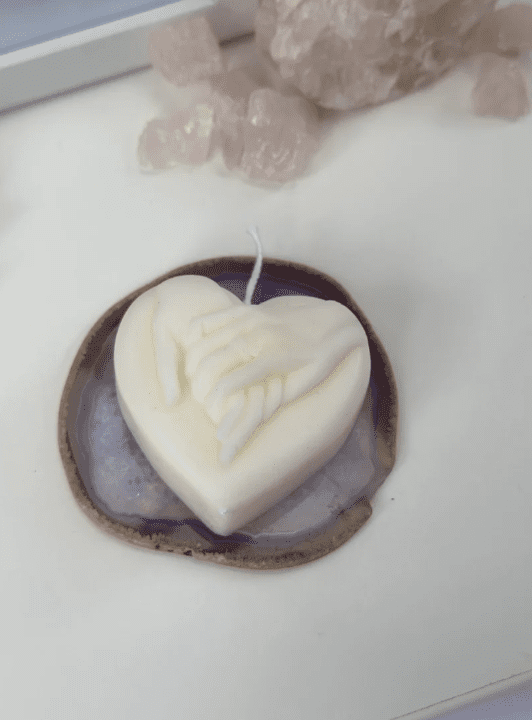 Introducing our Love Heart Candle, a symbol of love, warmth, and connection. Crafted with intricate detail, this candle depicts a heartfelt scene of hands gently cradling a glowing heart.