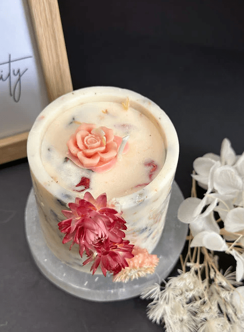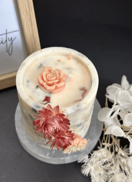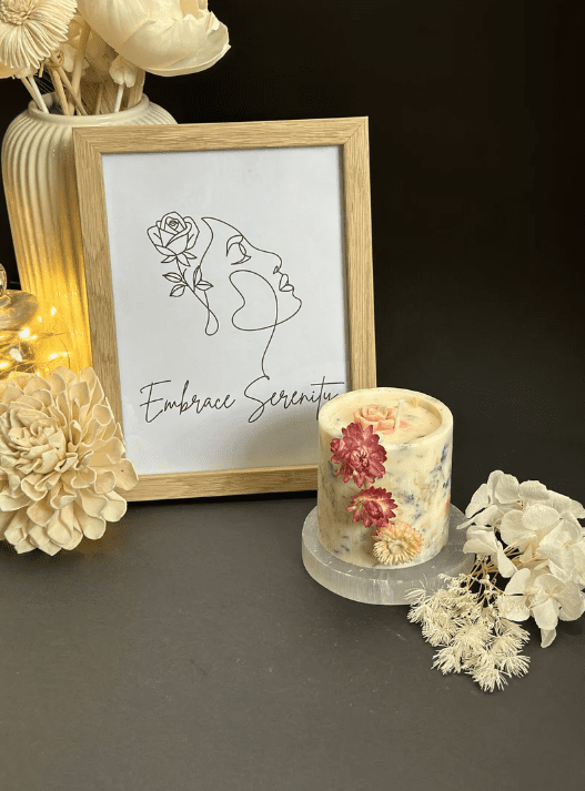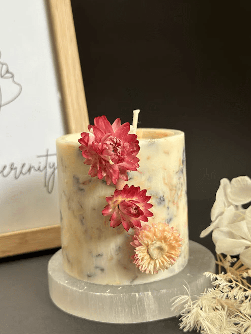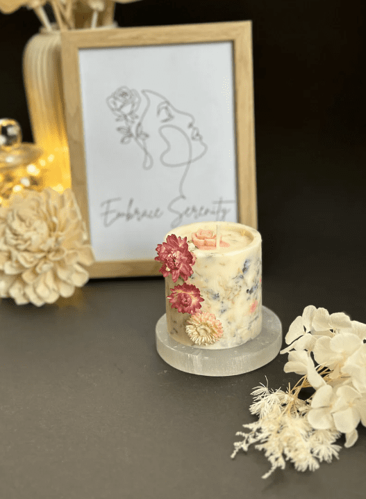 Our Floral Essence Candle, a harmonious blend of natural beauty and radiant light. Adorned with real flowers delicately placed along its sides, this candle is a true work of art, bringing the splendor of the garden into your home.