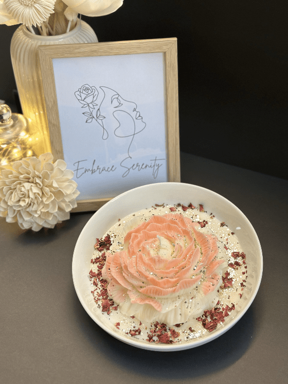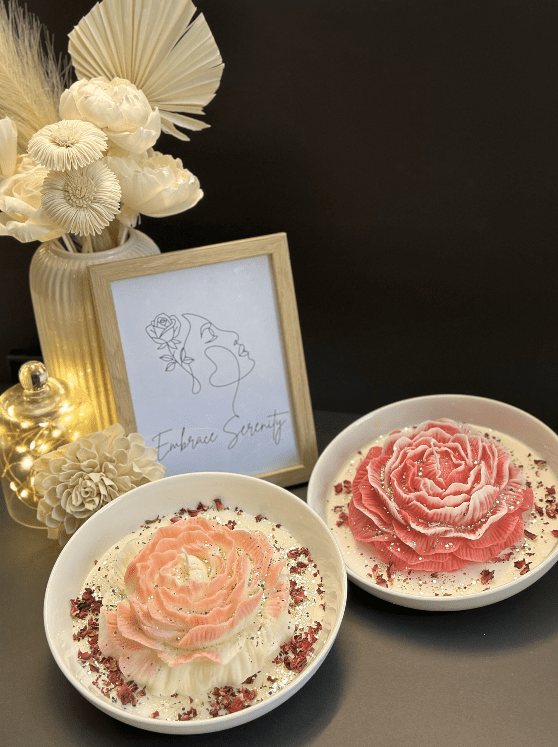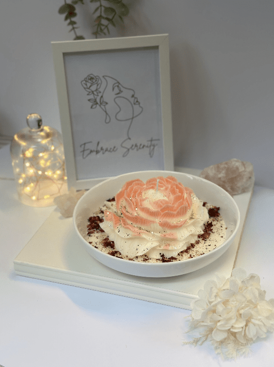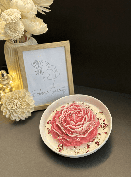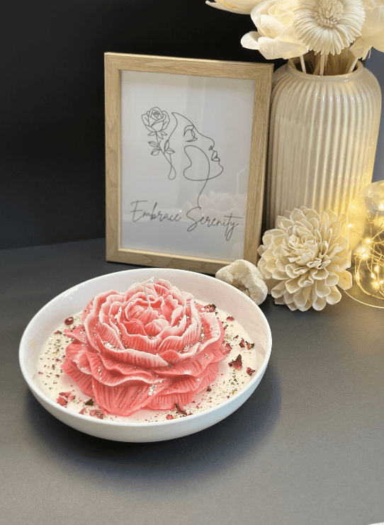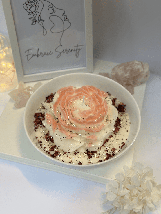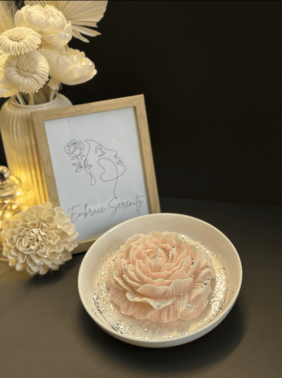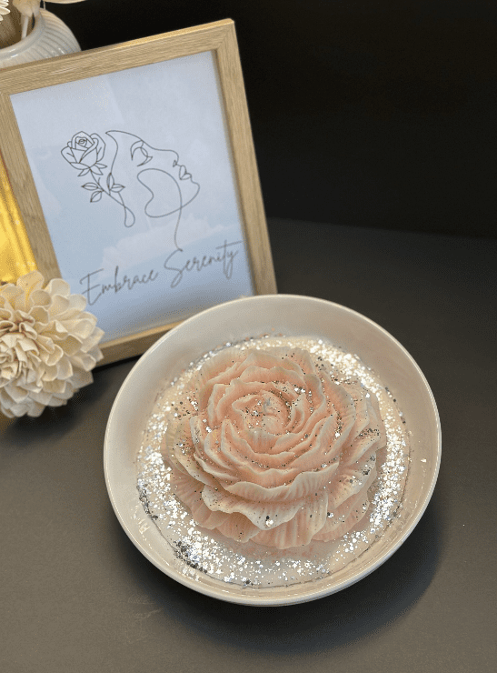 Introducing our Large Peony On Plate Candle, a stunning centerpiece that embodies elegance and beauty. This exquisite candle features a lifelike peony bloom delicately placed atop a decorative plate, creating a striking focal point for any room. The intricate details of the flower and plate add a touch of sophistication and refinement to your home decor.